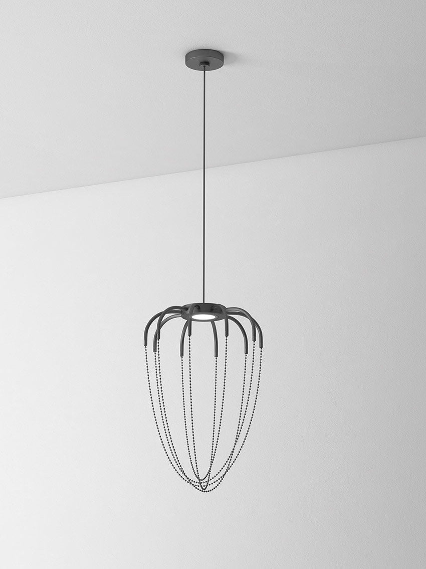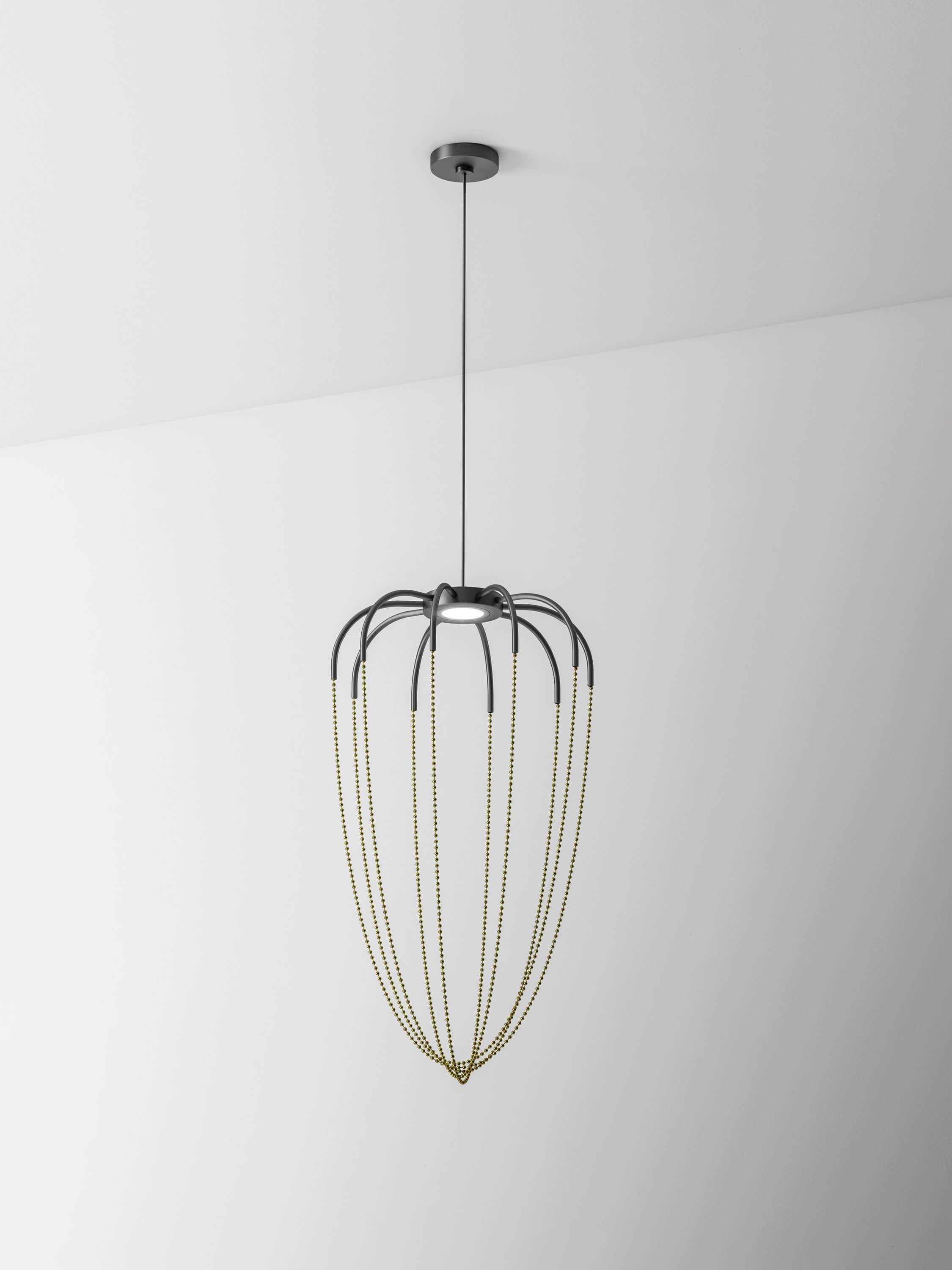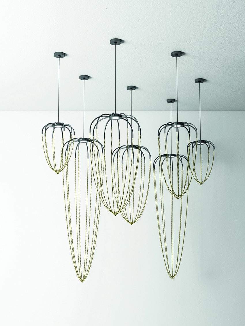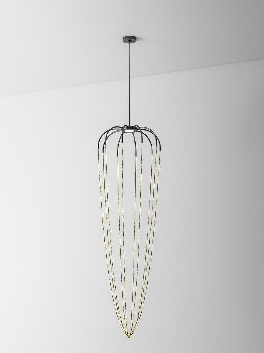 alluminio lavorato a mano e caratterizzata da preziose catenine che per caduta definiscono il diffusore.