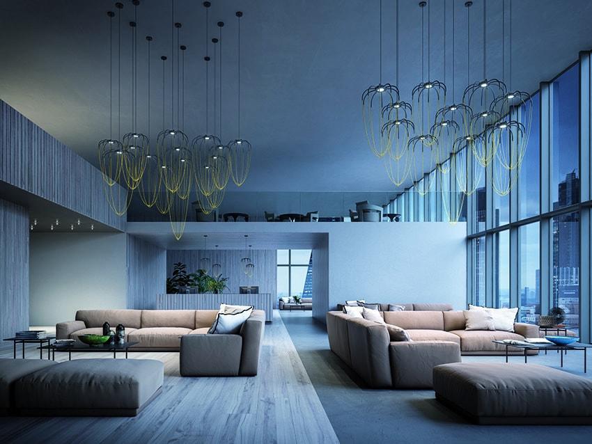 Il risultato è concreto, fisico, eppure fatto di aria e di luce. Il volume della lampada riempie lo spazio senza chiudere la visuale e l’occhio attraversa l’oggetto: è così che la lampada diventa strumento importante per il progettista che vuole definire uno spazio.