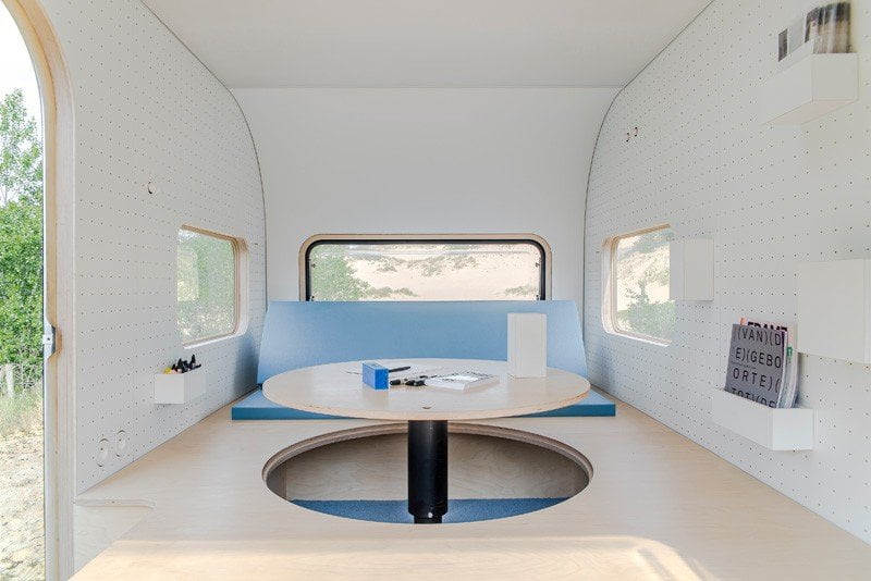 Un tavolo circolare è integrato nella superficie, nascosto sotto il materasso. Quando è il momento di lavorare basta piegare il materasso ed estrarre il piano.