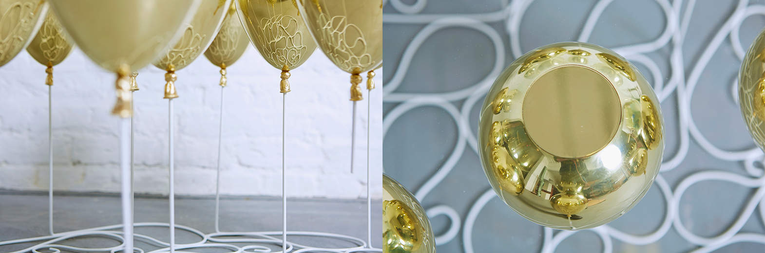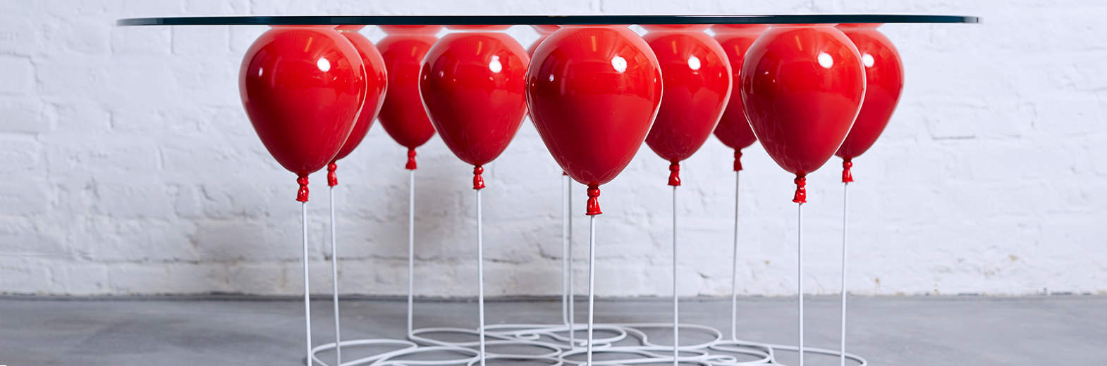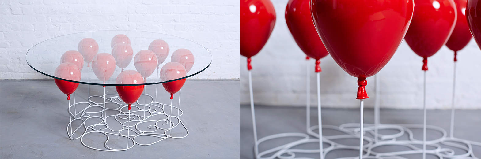 Materiali di alta qualità vanno a comporre gli elementi della struttura. Il piano è in vetro temperato, mentre i palloncini sono realizzati in acciaio e resina composita.