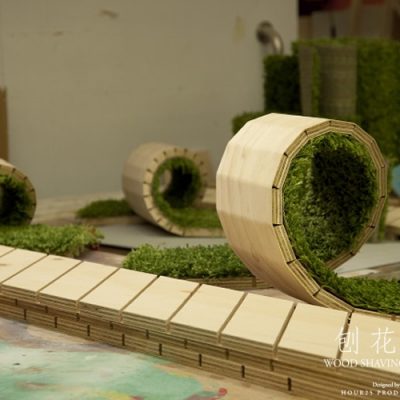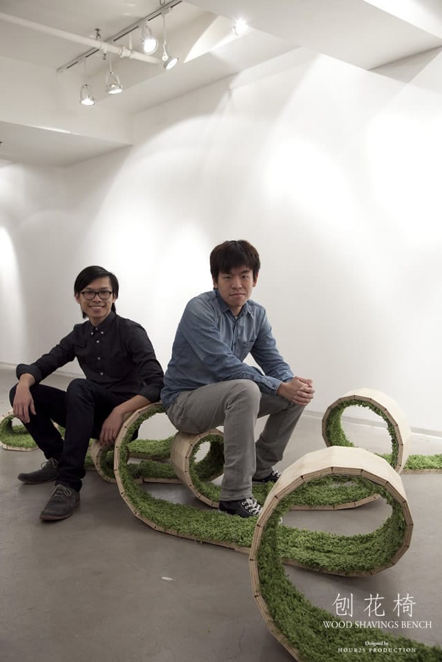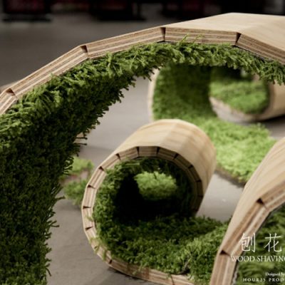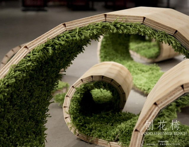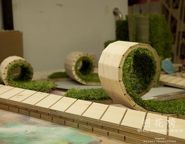 Lai Wing Fung William, Choi Kit Wang, Chan Yiu Kwan Bill, So Tze Shun Jason, i quattro #designer di HOUR25 di Hong Kong hanno realizzato una panchina in legno truciolato a forma di spirale. Internamente la panchina è rivestita da un tappeto in erba.